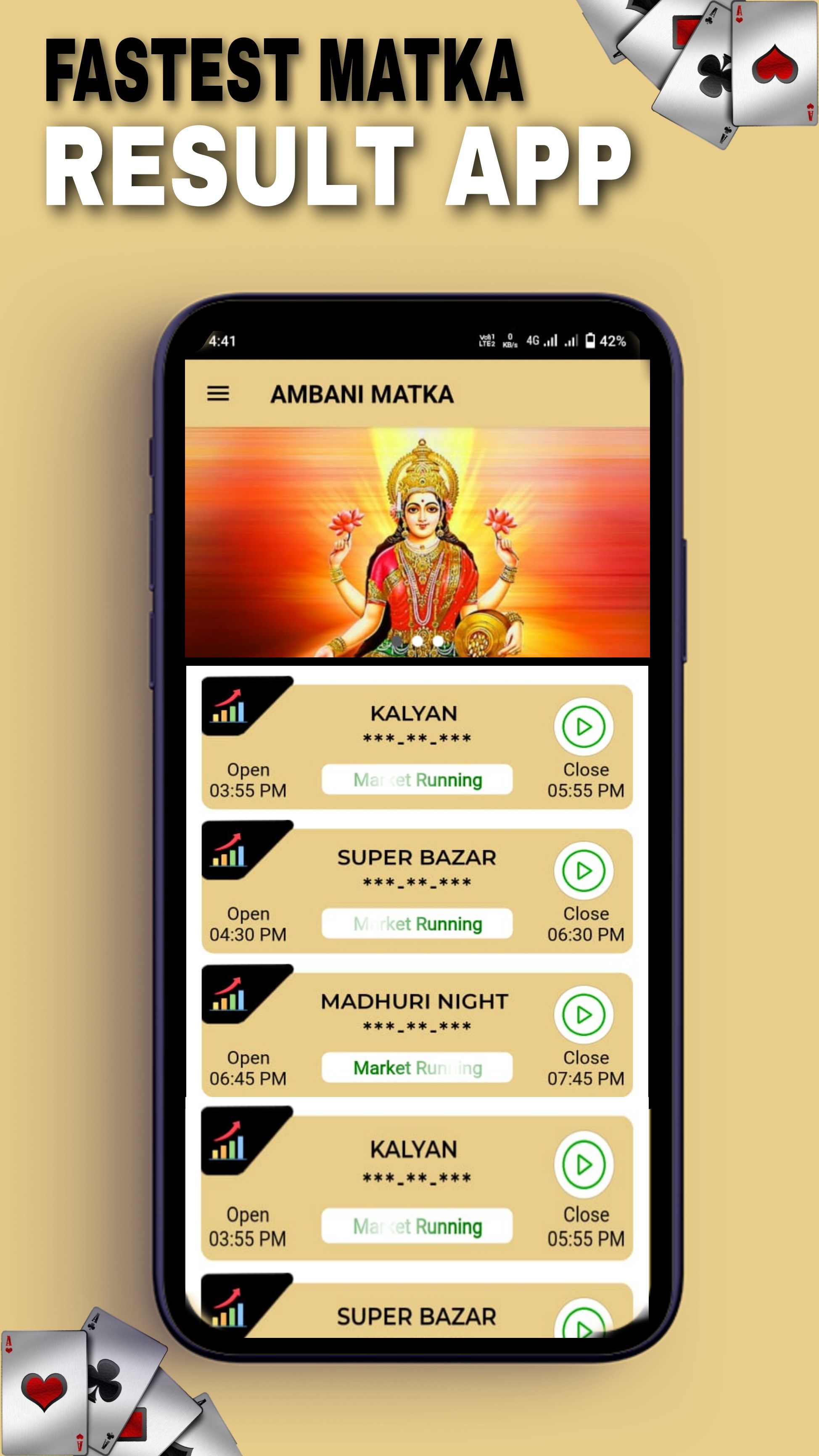 Welcome AMBANI MATKA Official Company App. Enjoy Matka Games With Us. Welcome To AMBANI MATKA OFFICIAL APP. Download And Join With Us For Best And Trust Experience Of Matka Games. Why Choose Us - Our main aim is to take Matka game to the next level by taking it online. We are making a change in the industry by making Matka Game available on the internet. Step to Register with us- 1. First Download our App AMBANI MATKA OFFICIAL APP From Play Store. 2. If you are new user click on "SIGN UP" Button. 3. Enter your Name , Phone number and create a strong password. 4. Now you will receive a 4 digit OTP on the number you entered. 5. Enter the OTP and you are successfully registered. If you face any problem in registration you can contact us through the number we have given in the app . We will help you to register with us on AMBANI MATKA APP. Our Speciality - We at AMBANI MATKA OFFICIAL Company has a best customer support team. They are available to help you 24×7/365 Days. We provide best game rates for Matka like below 1. Single (ANK) - 10 ka 100 2. Jodi - 10 ka 1000 3. Single Panna - 10 ka 1600 4. Double Panna - 10 ka 3200 5. Triple Panna - 10 ka 7000 6. Half Sangam - 10 ka 10000 7. Full Sangam - 10 ka 100000 Fastest Result- AMBANI MATKA APP provide you the fastest and accurate results for Matka Markets and Bazar. Matka Markets - We have all the major markets like MILAN MORNING, MADHUR MORNING , KALYAN MORNING , SRIDEVI , TIME BAZAR , MADHUR DAY , MILAN DAY , RAJDHANI DAY , SUPREME DAY, KALYAN , SRIDEVI NIGHT , MADHUR NIGHT , SUPREME NIGHT , MILAN NIGHT , RAJDHANI NIGHT , KALYAN NIGHT , MAIN BAZAR , MAIN DUBAI. Note : We will add Markets If requested by our users. We need your consistent support to get going. If you have enjoyed any feature of the " AMBANI MATKA APP" Do not forget to rate us on Play store. Please help us by spreading this app amongst your friends. If you have any feedback or suggestions, please write to us at . We would love to hear from you!